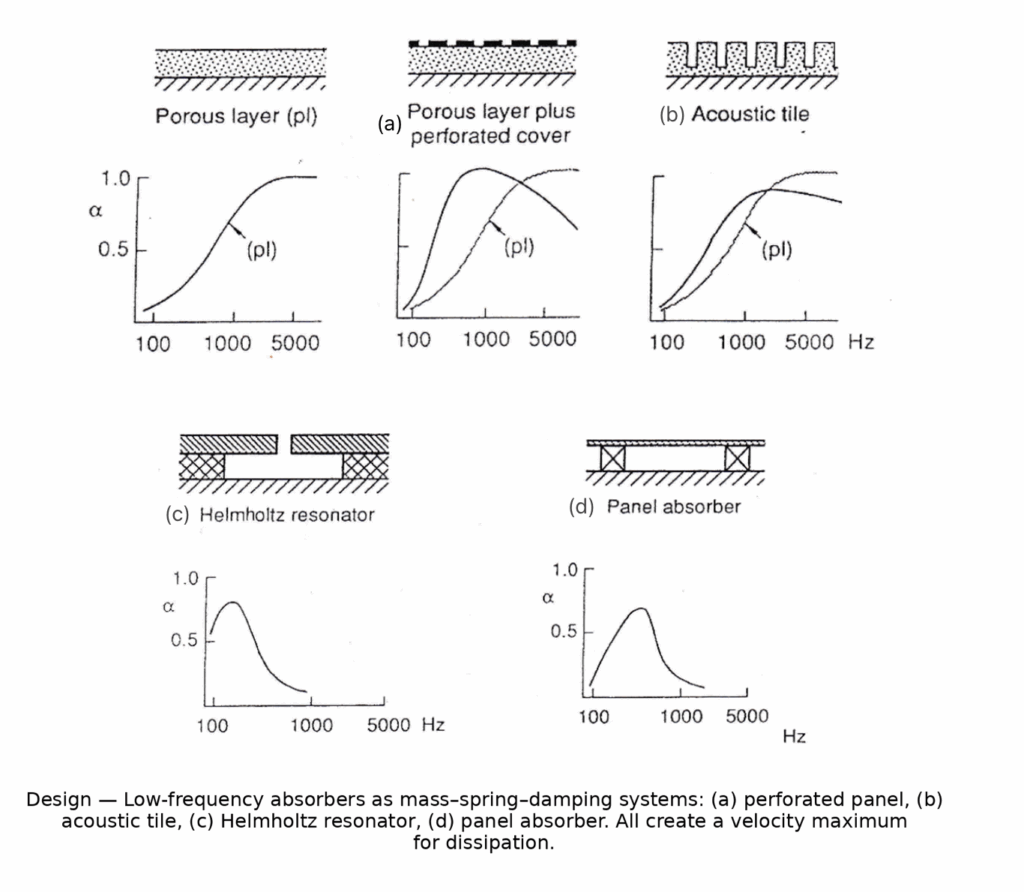 - (c) Helmholtz resonator : neck air = mass, cavity = spring; enables tuned low-frequency absorption