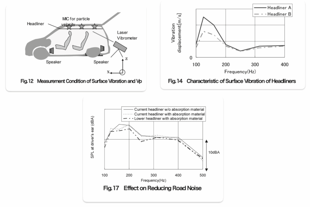 Fig. 12, 14, 17: In the vehicle, a two-layer headliner was implemented. Measurements of particle velocity and laser vibrometer confirmed a reduction in road noise. A softer headliner (A), offering more mobility plus damping, produced higher surface particle velocity → more internal dissipation → lower SPL, outperforming a stiffer headliner (B) at low frequencies.
